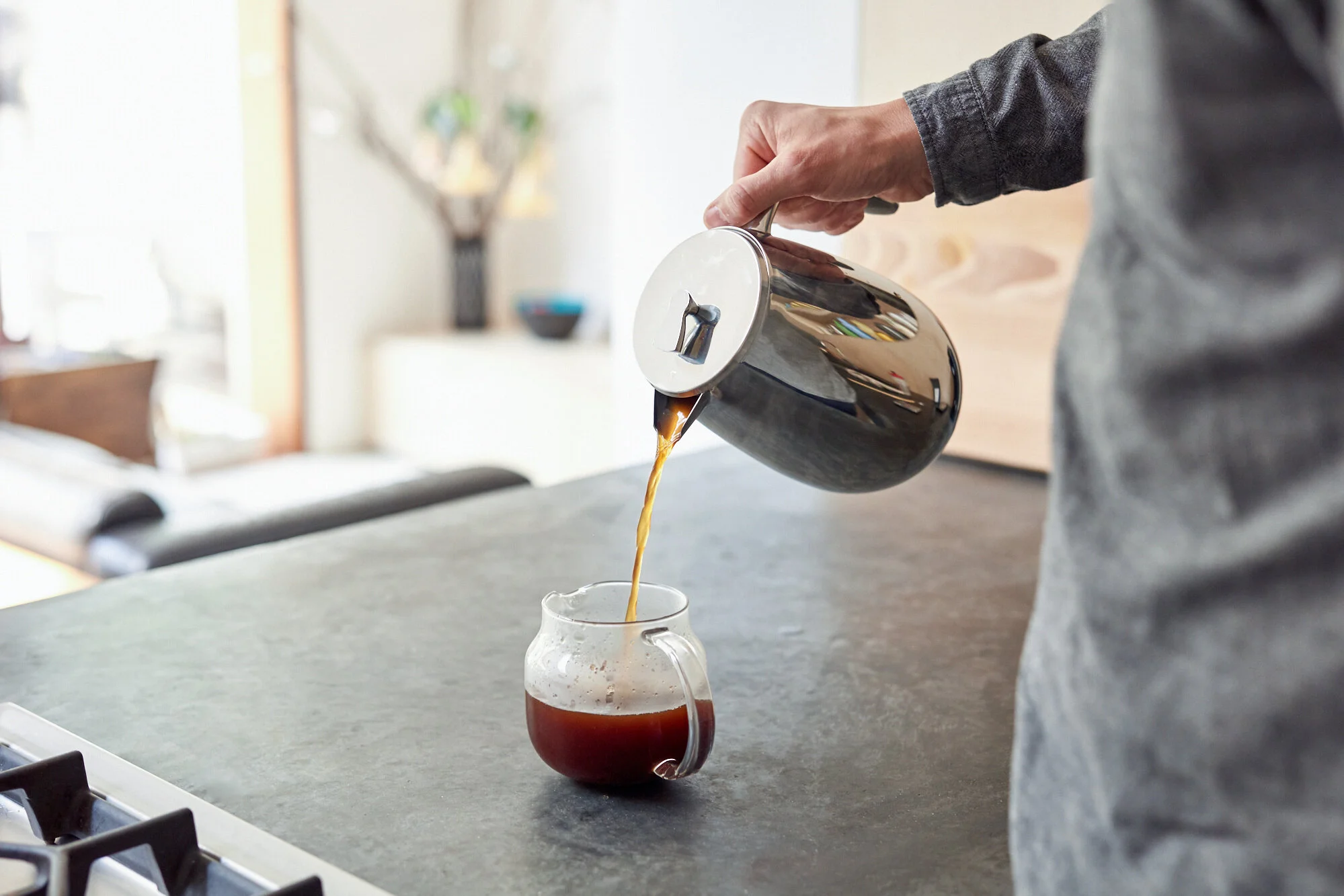 By decanting your coffee rather than holding it in the French Press, you've stopped the extraction process and left as much silt as possible behind. Your coffee will continue to clarify in the decanter, so wait a while longer – at least 2 minutes – before pouring into your chosen cups.